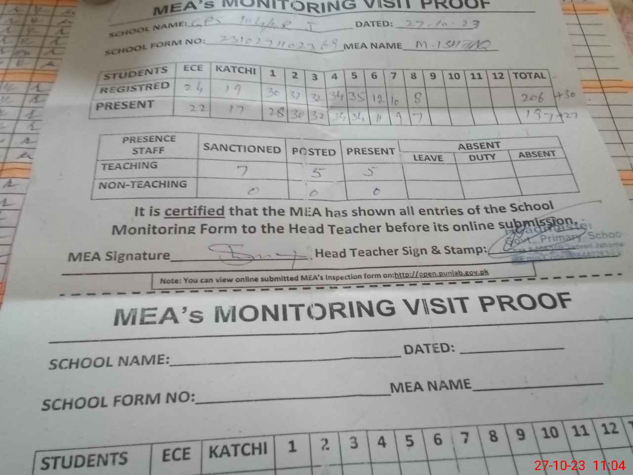 | Attendance Register | Head Teacher | MEA with School | Visit Proof |