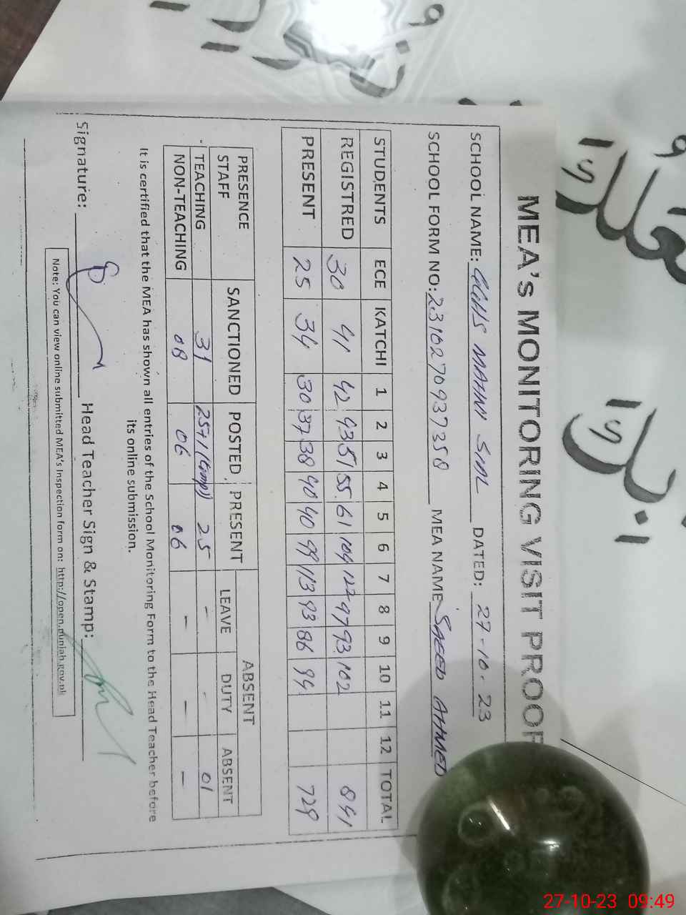 | Attendance Register | Head Teacher | MEA with School | Visit Proof |