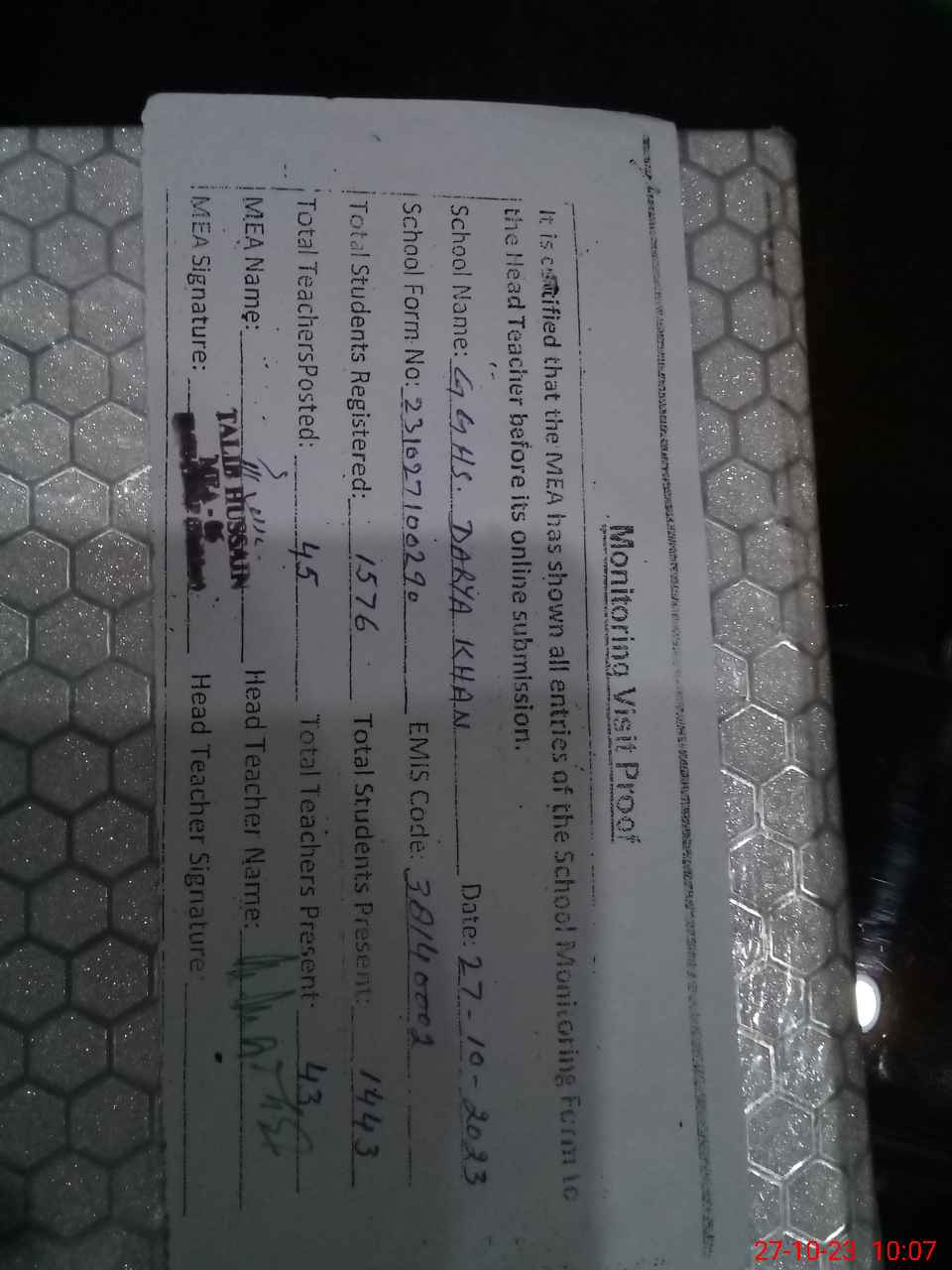 | Monitoring Date: 27-10-2023 | Start Time: 27-10-2023 09:04 AM | End Time: 27-10-2023 10:18 AM | Name of MEA: Ta**** Hu**** | |