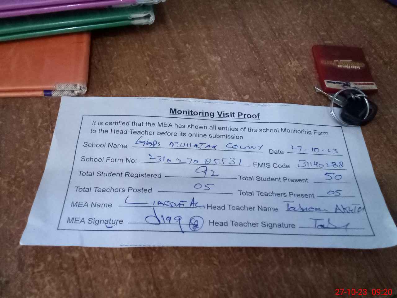 | Attendance Register | Head Teacher | MEA with School | Visit Proof |