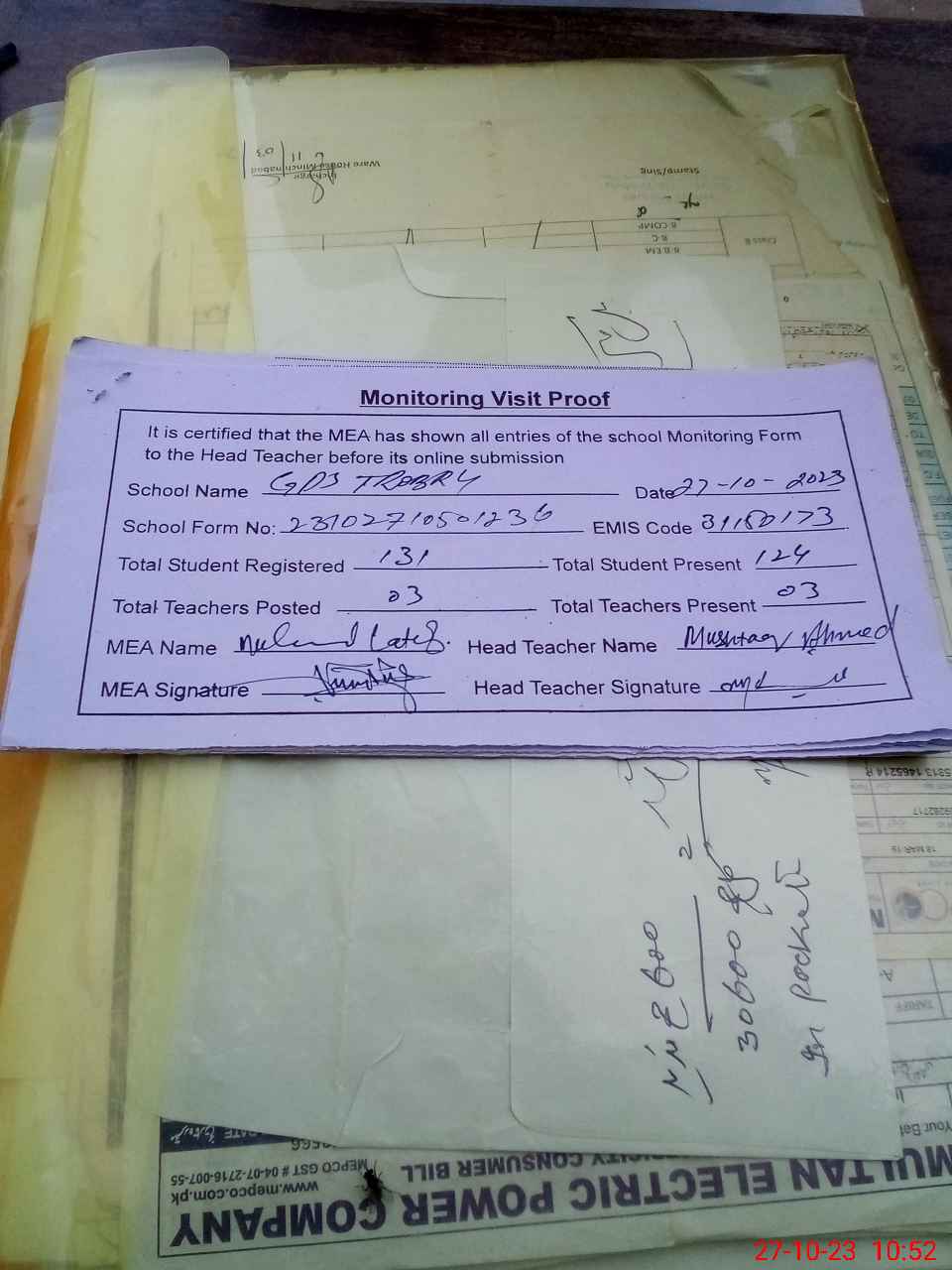 | Attendance Register | Head Teacher | MEA with School | Visit Proof |