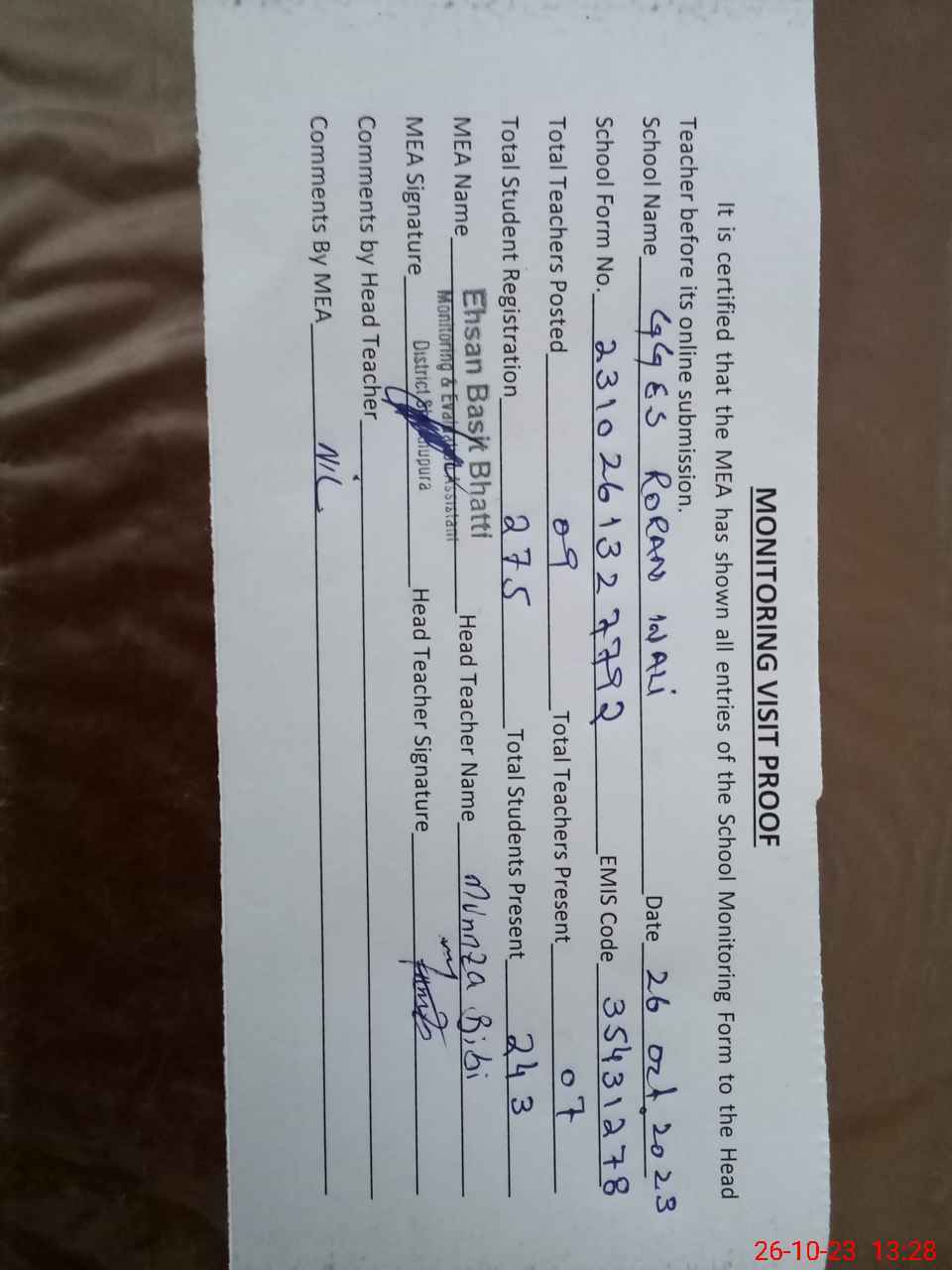 | Attendance Register | Head Teacher | MEA with School | Visit Proof |
