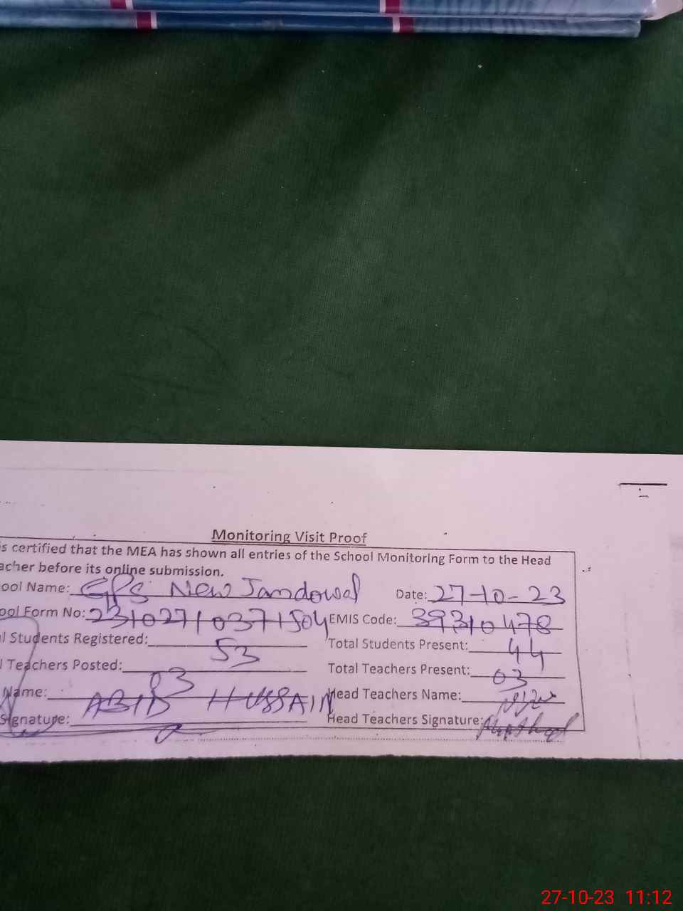 | Attendance Register | Head Teacher | MEA with School | Visit Proof |