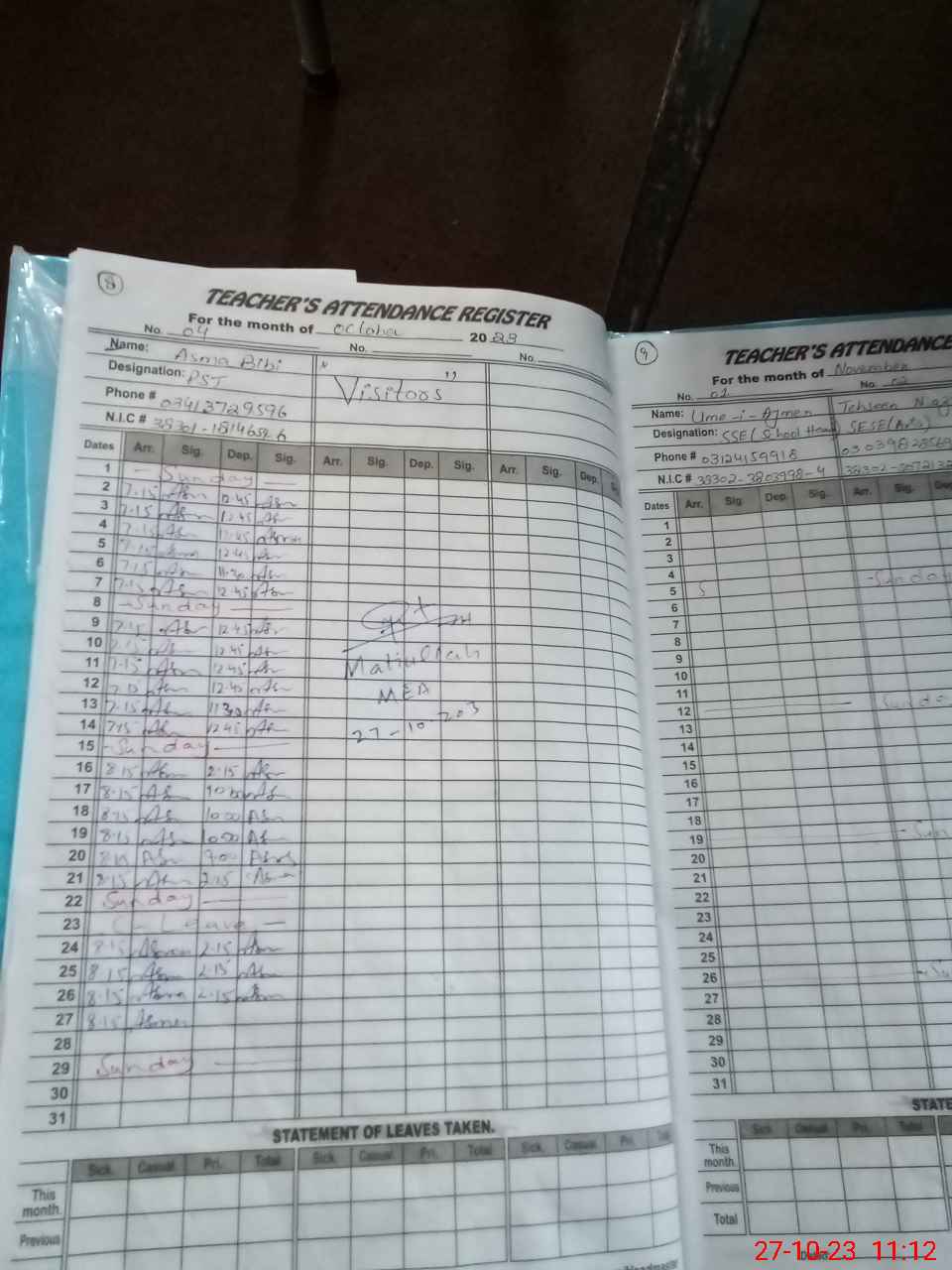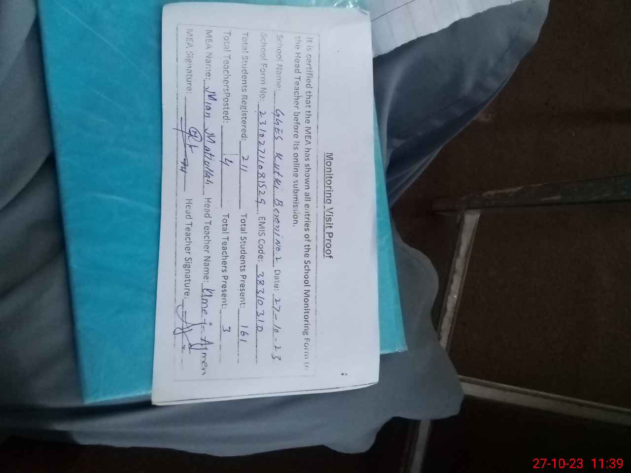 | Attendance Register | Head Teacher | MEA with School | Visit Proof |