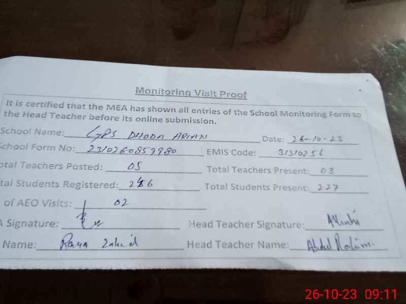 | EMIS Code: 31310256 | Name of School: GPS DODA ARAIN | |||