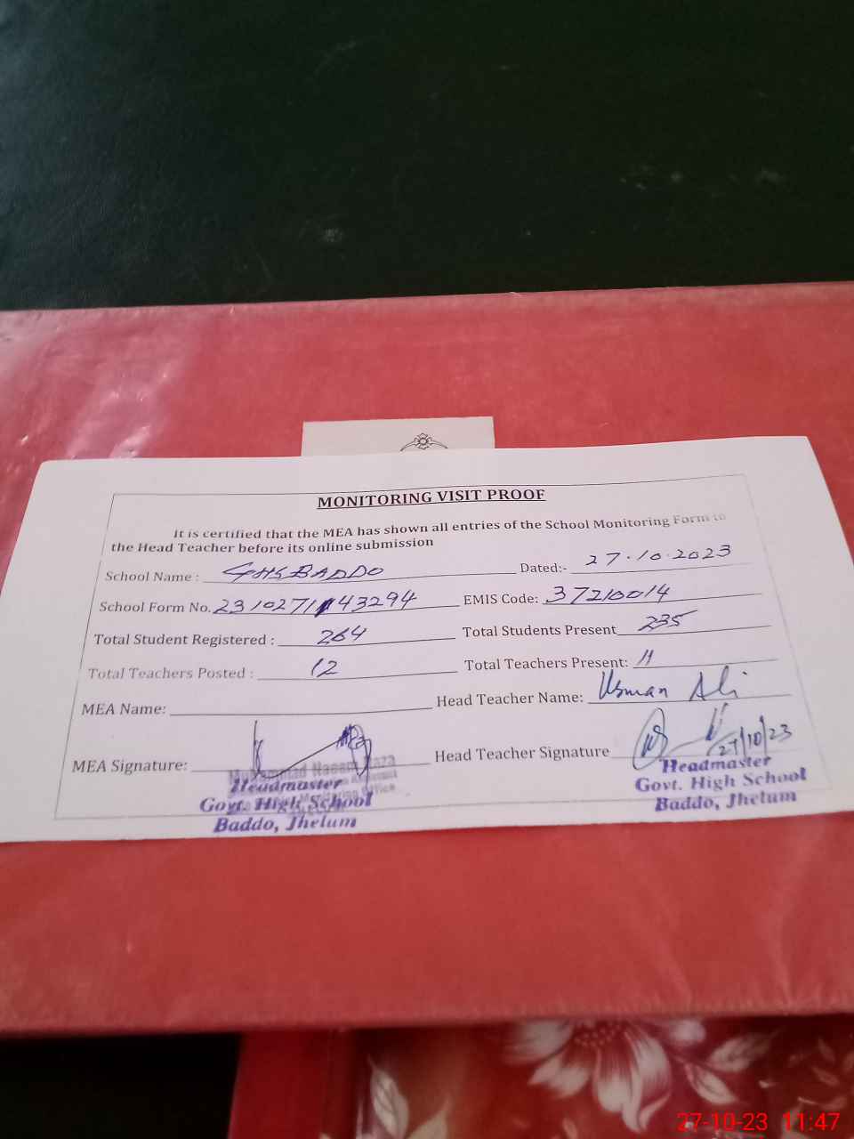 | Certified that this School was Inspected by the Undersigned MEA/DMO Today and the Information Stated Above is as Per Record. | |||||