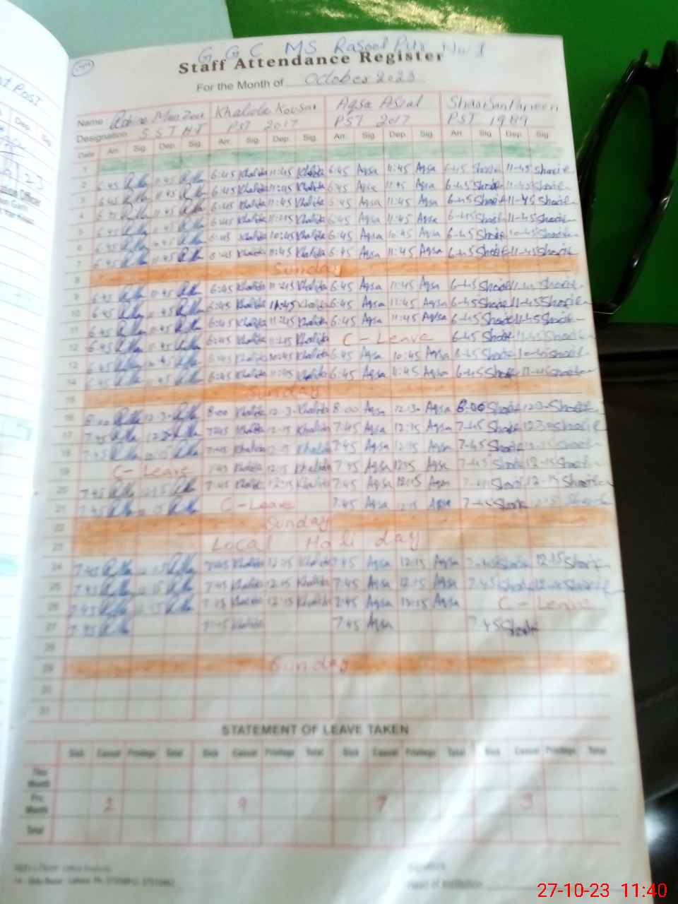 | Leave | Duty | Absent | Maternity | Medical | Ex- Pak |