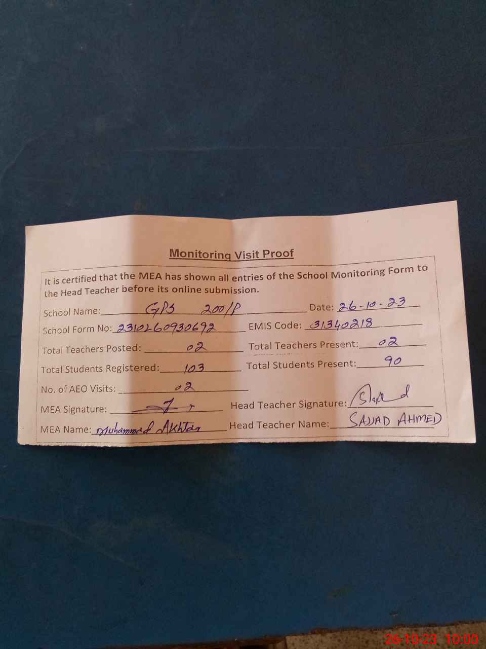 | Monitoring Date: 26-10-2023 | Start Time: 26-10-2023 09:30 AM | End Time: 26-10-2023 10:00 AM | Name of MEA: Mu**** Ak**** | |