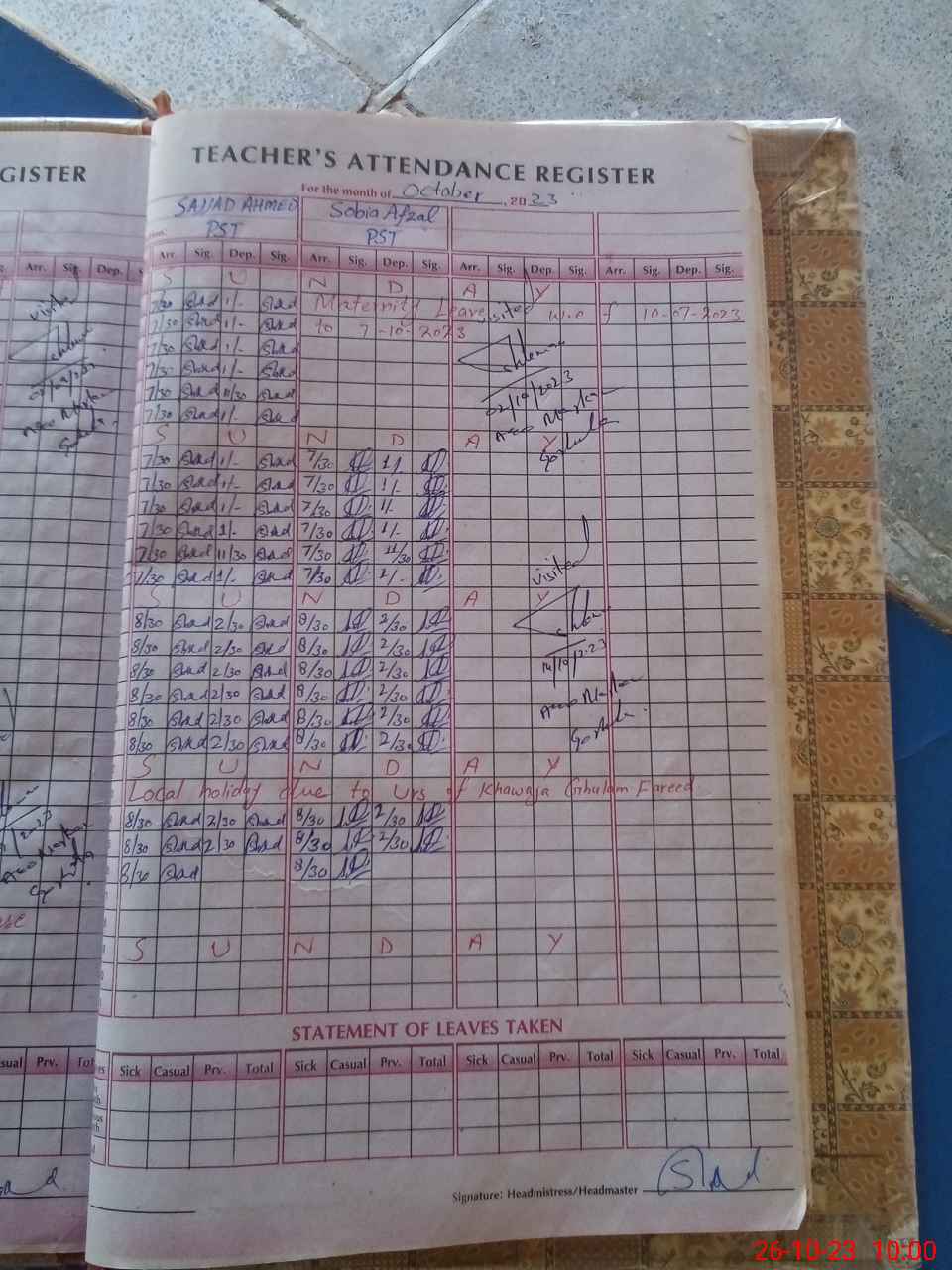 | Name: SA**** AH**** Designation: (School Headmaster's/Headmistress's) PST Phone/Cell Number: 03**** |