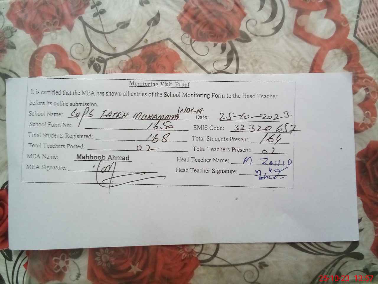 | EMIS Code: 32320657 | Name of School: GPS FATEH MUHAMMAD WALA | |||