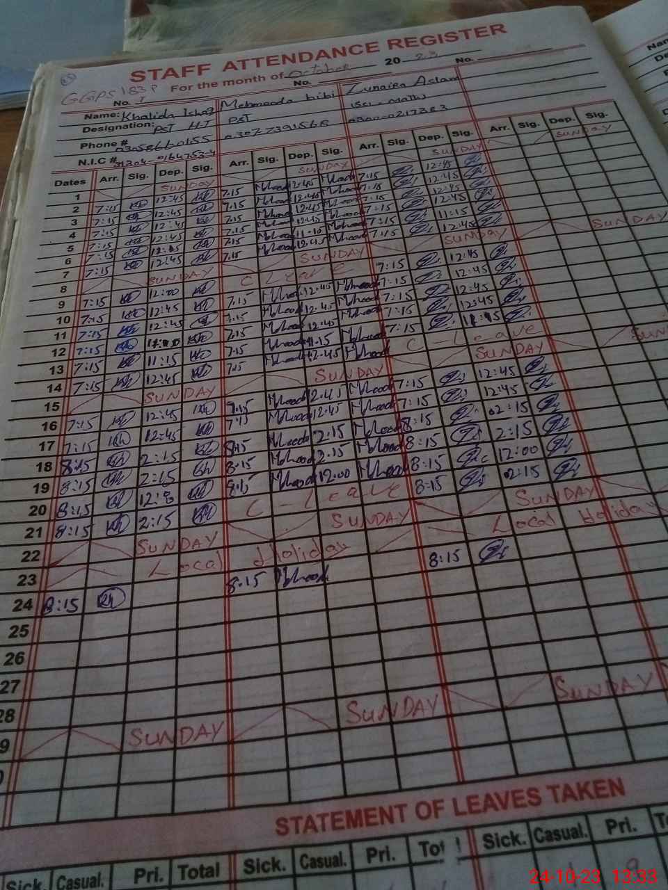| Name: Kh**** Is**** Designation: (School Headmaster's/Headmistress's) PST Phone/Cell Number: 03**** |