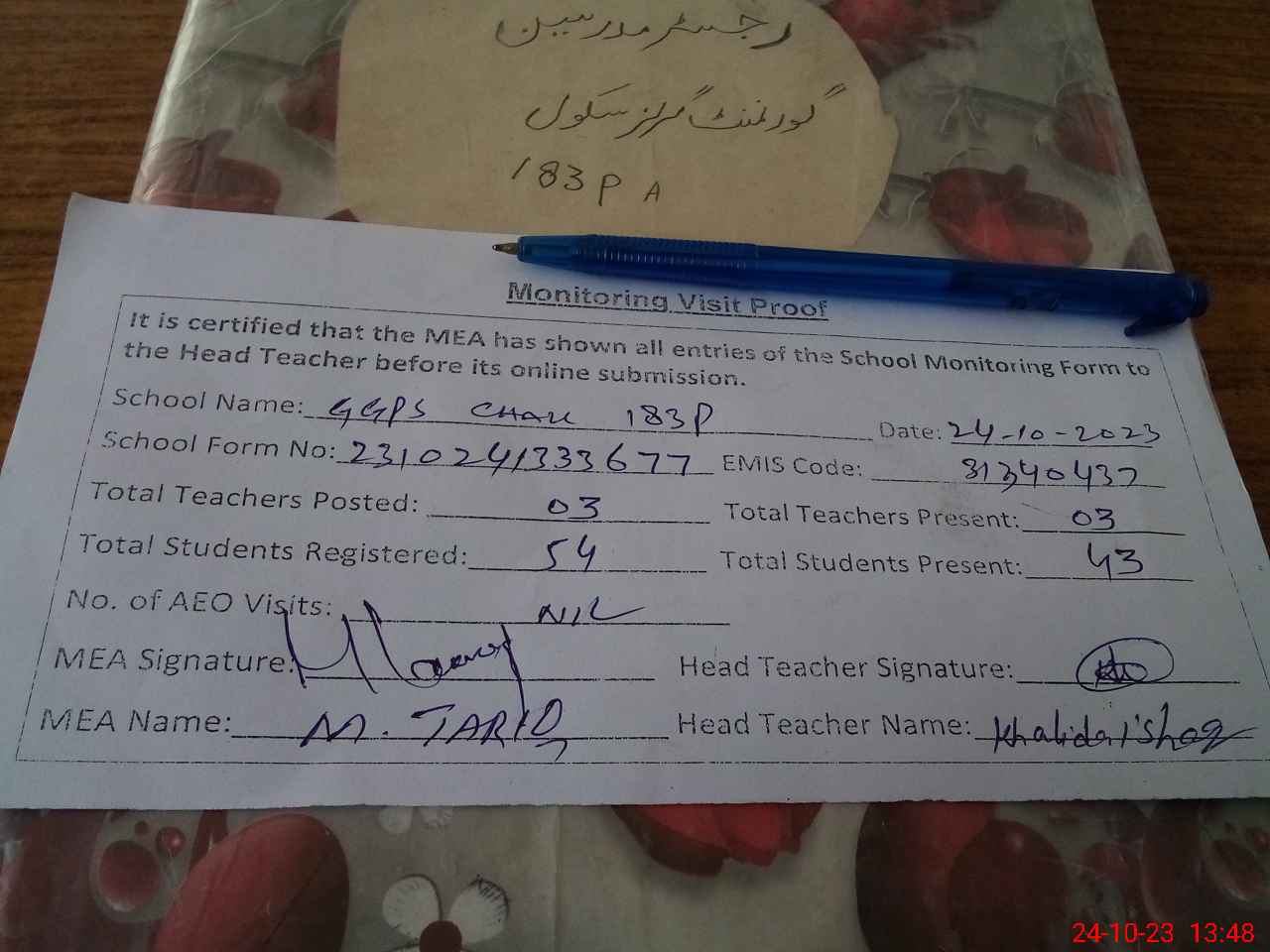 | Attendance Register | Head Teacher | MEA with School | Visit Proof |