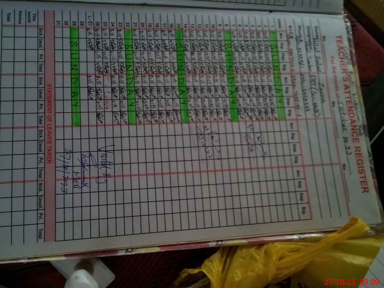 | Monitoring Date: 27-10-2023 | Start Time: 27-10-2023 09:08 AM | End Time: 27-10-2023 09:29 AM | Name of MEA: GH**** DA**** (R**** | |