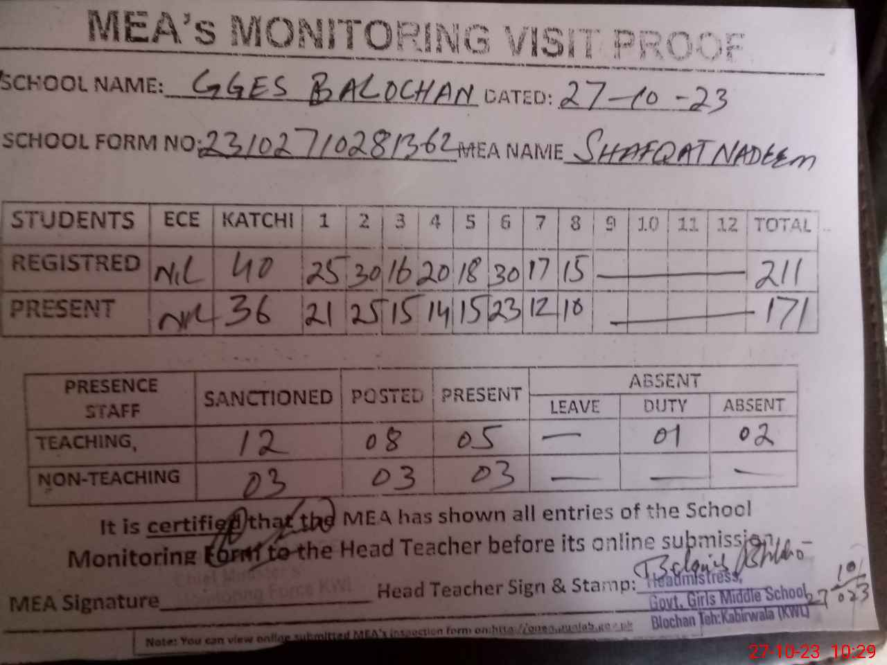| Attendance Register | Head Teacher | MEA with School | Visit Proof |