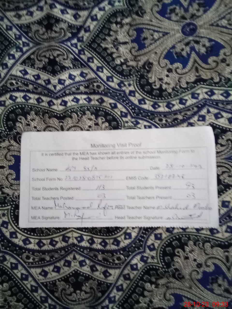 | Attendance Register | Head Teacher | MEA with School | Visit Proof |