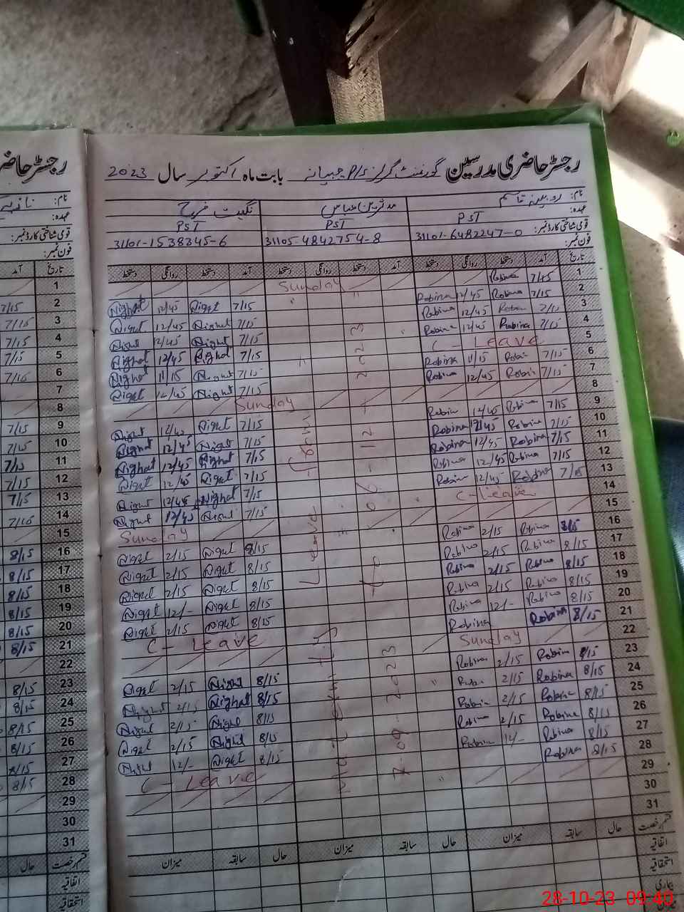 | CNIC | Full Name | Designation | R/C | Absence During Last Calender Month |
