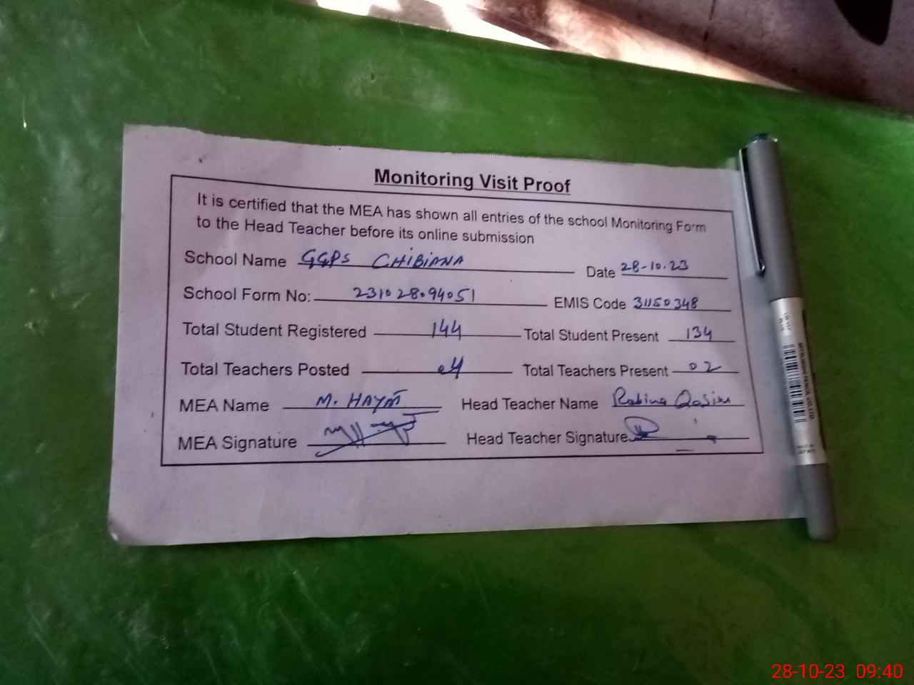| Attendance Register | Head Teacher | MEA with School | Visit Proof |