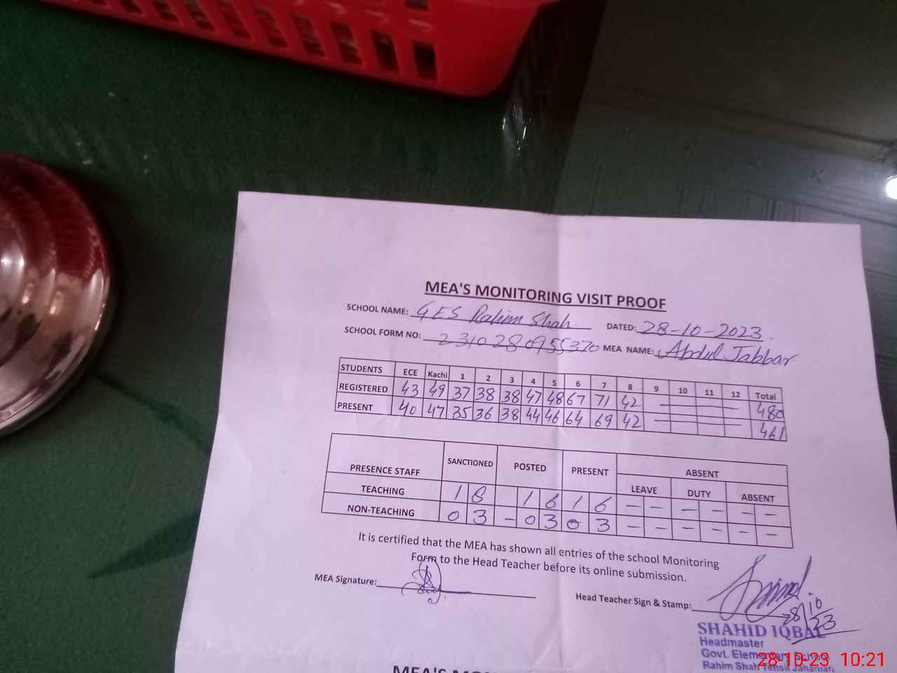 | Attendance Register | Head Teacher | MEA with School | Visit Proof |