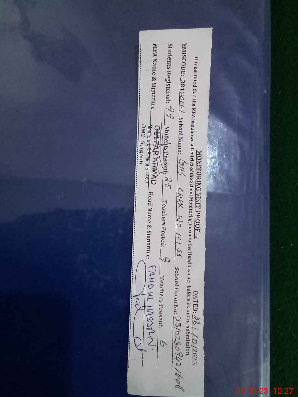 | Monitoring Date: 28-10-2023 | Start Time: 28-10-2023 09:42 AM | End Time: 28-10-2023 10:27 AM | Name of MEA: GU**** AH**** | |