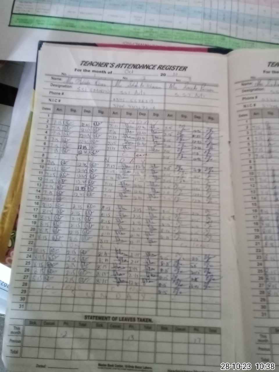 | CNIC | Full Name | Designation | R/C | Absence During Last Calender Month |