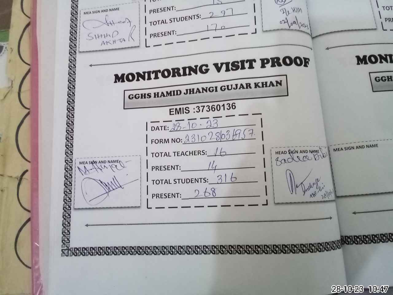 | Attendance Register | Head Teacher | MEA with School | Visit Proof |