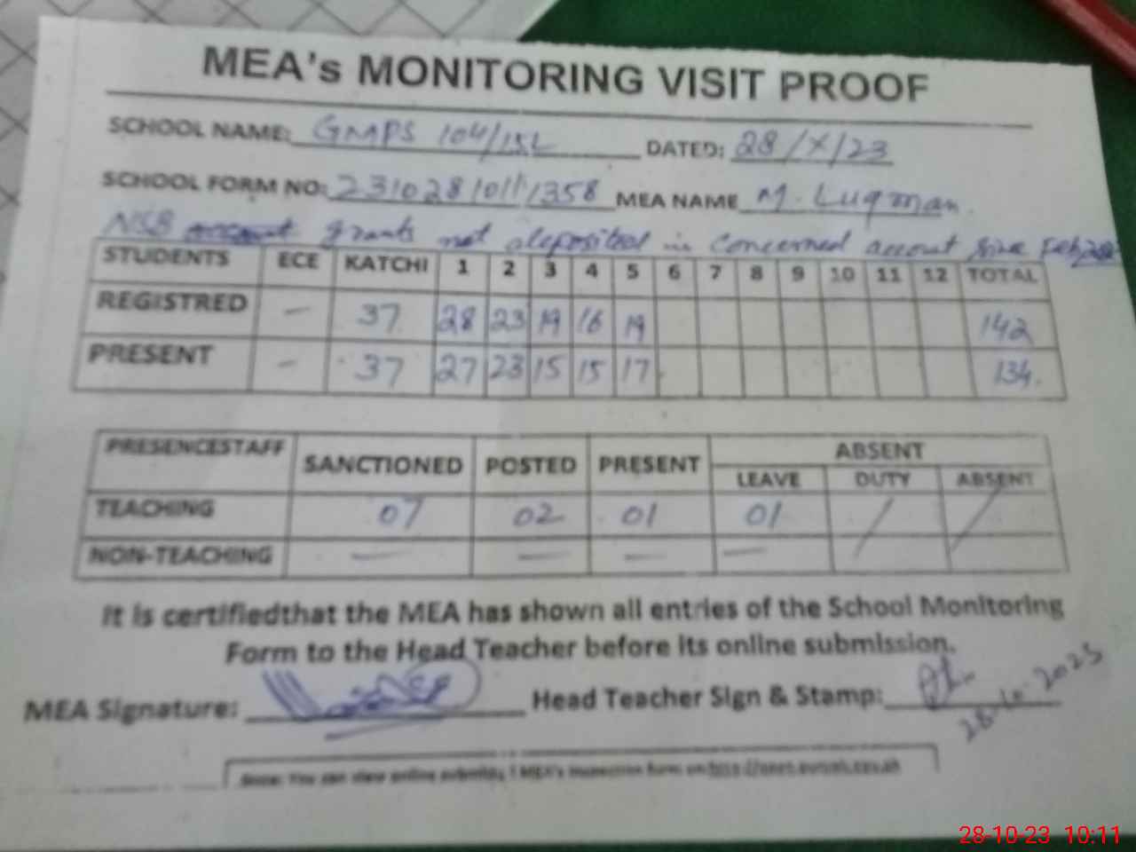 | Attendance Register | Head Teacher | MEA with School | Visit Proof |