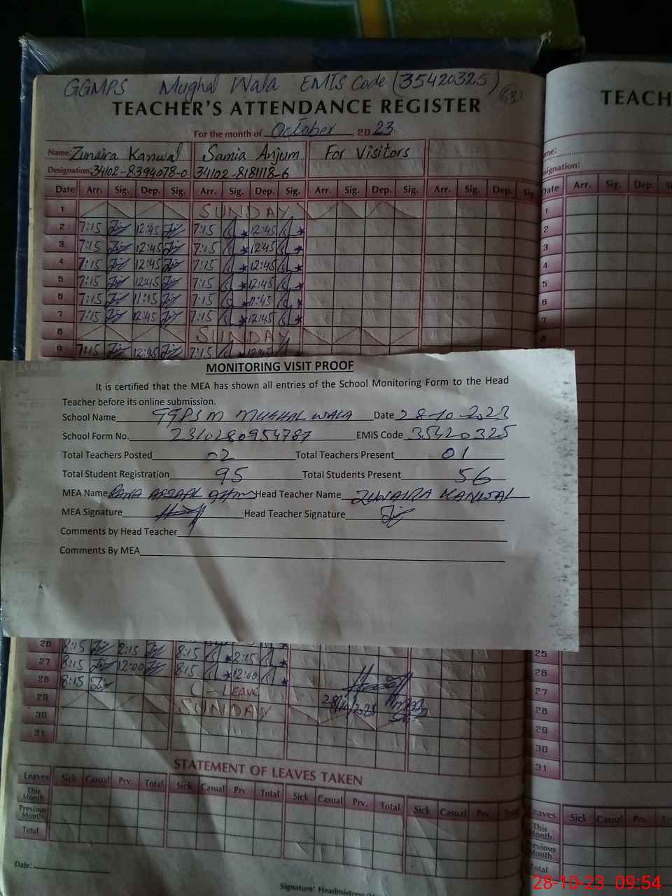 | Attendance Register | Head Teacher | MEA with School | Visit Proof |