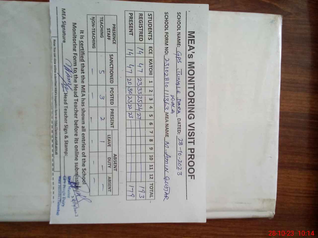 | Attendance Register | Head Teacher | MEA with School | Visit Proof |