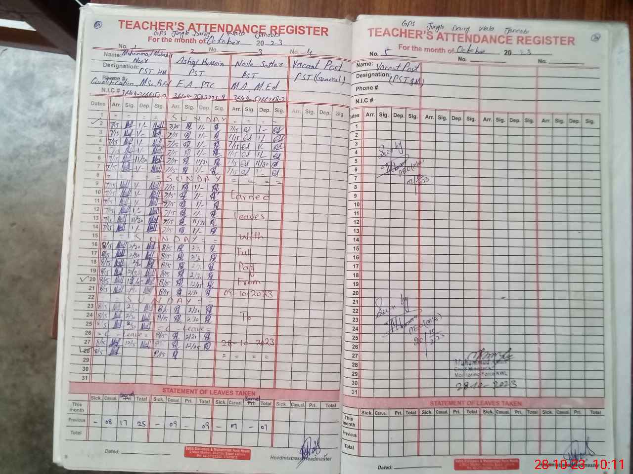 | CNIC | Full Name | Designation | R/C | Absence During Last Calender Month |