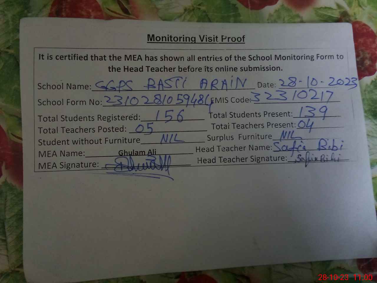 | EMIS Code: 32310217 | Name of School: GGPS BASTI ARAIN | |||