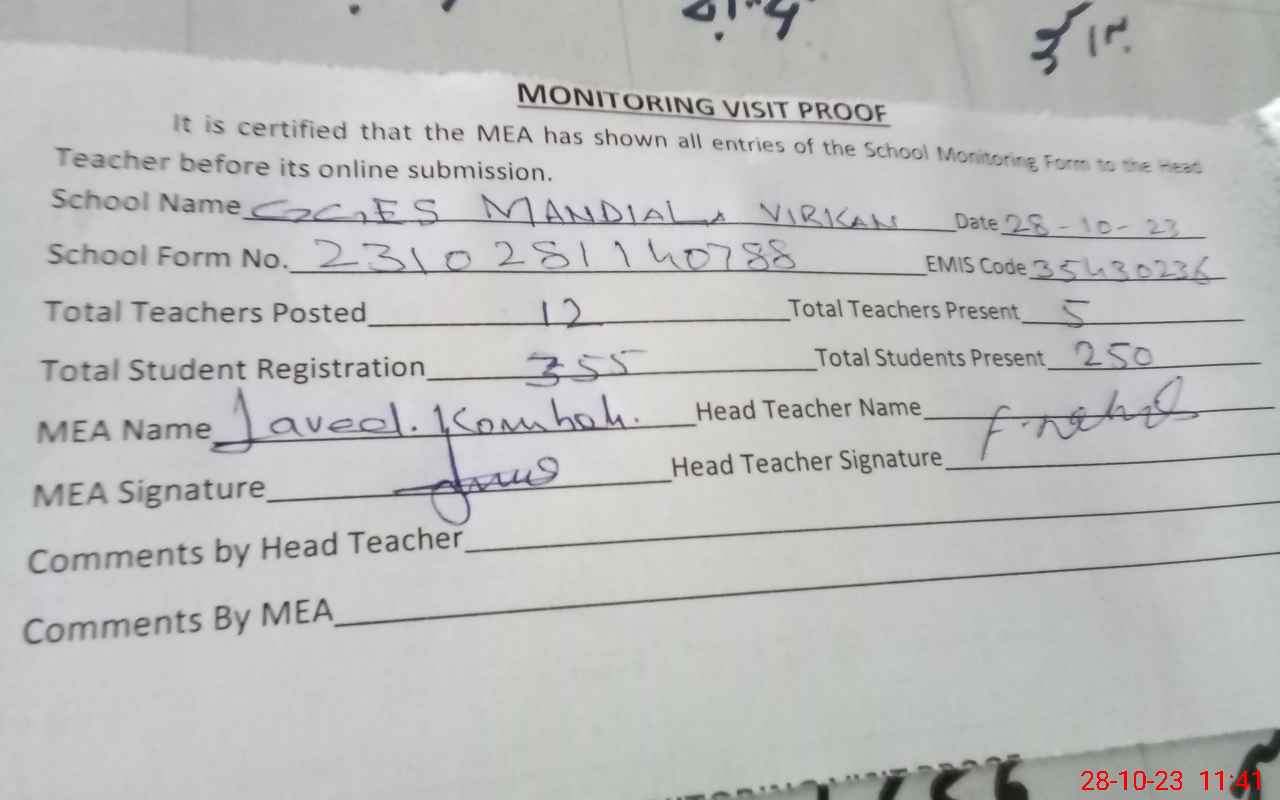 | Attendance Register | Head Teacher | MEA with School | Visit Proof |