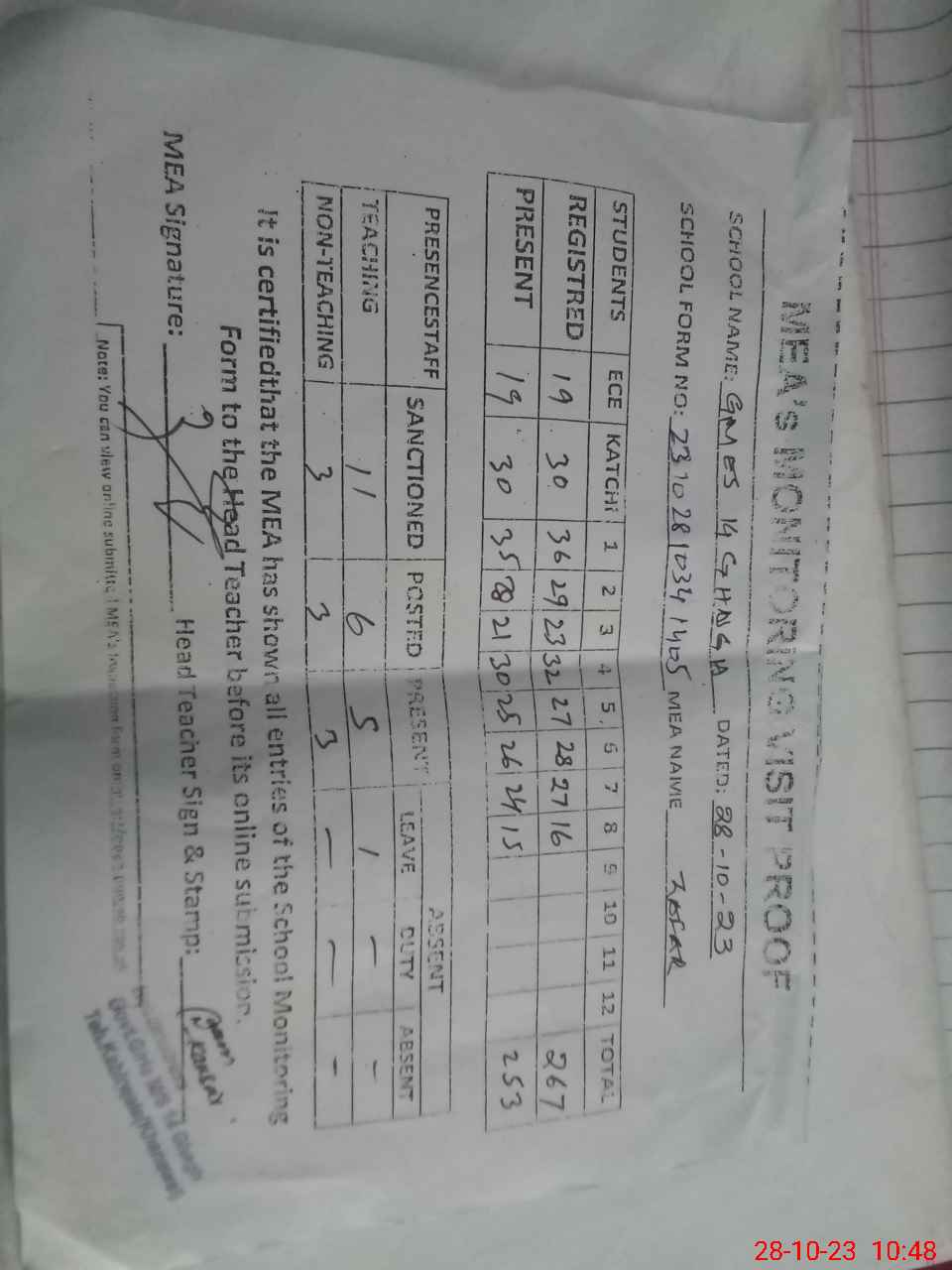 | Attendance Register | Head Teacher | MEA with School | Visit Proof |