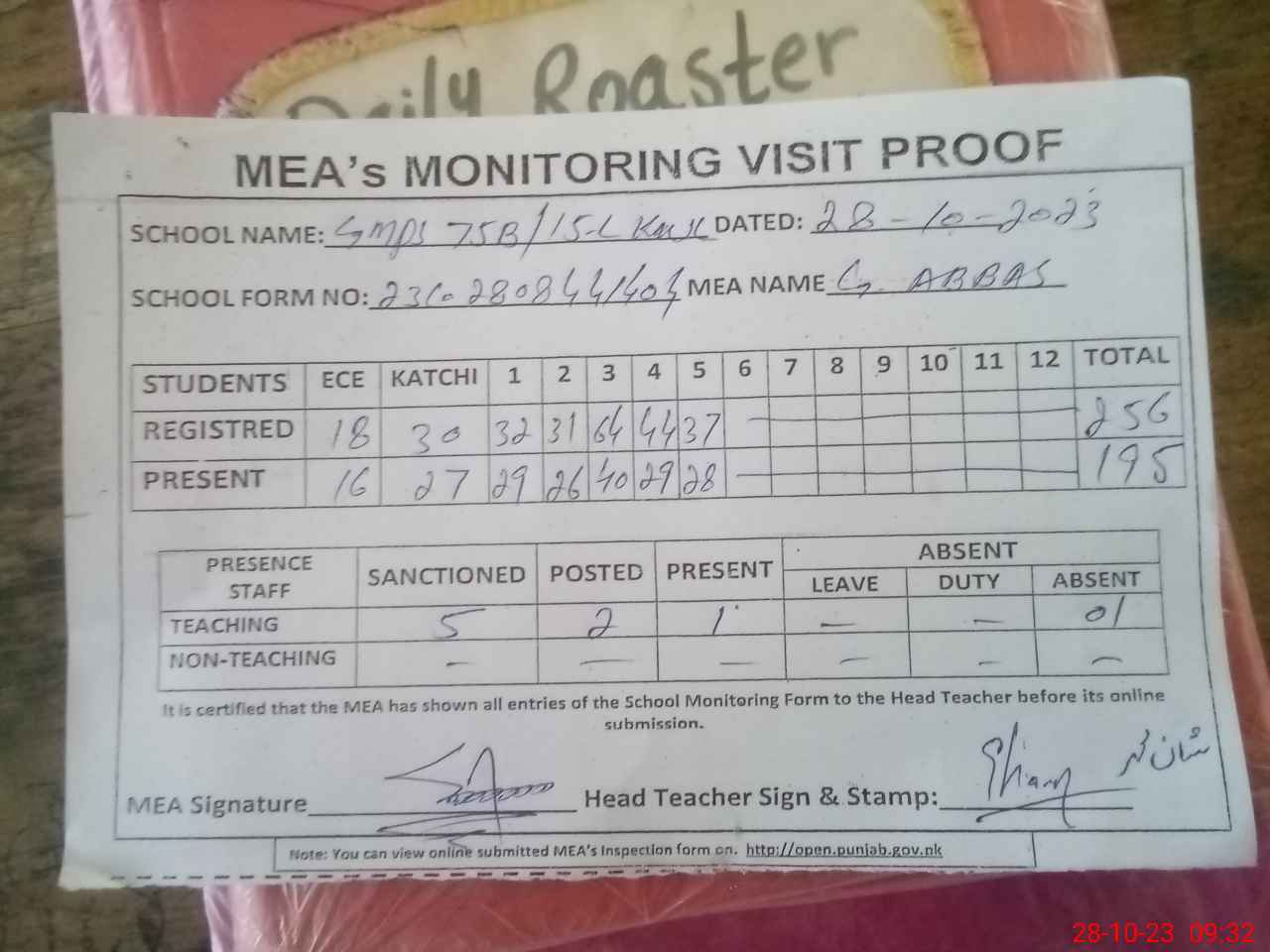 | Attendance Register | Head Teacher | MEA with School | Visit Proof |