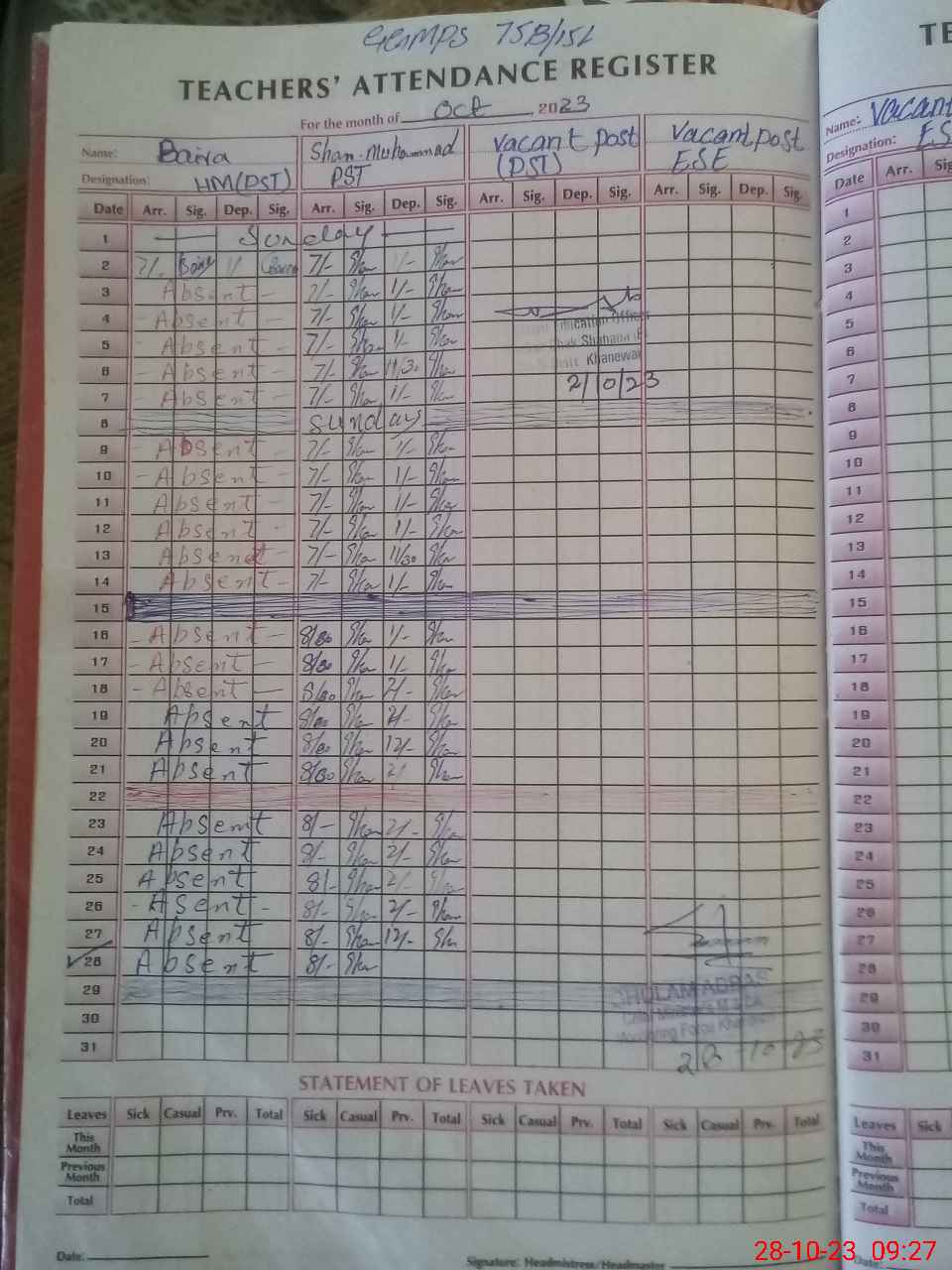 | Name: Sh**** Mu**** Designation: (School Headmaster's/Headmistress's) PST Phone/Cell Number: 03**** |