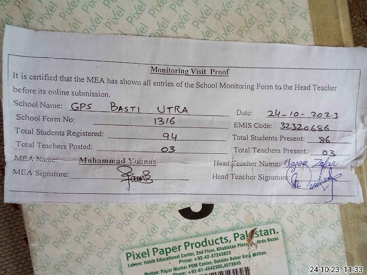 | Attendance Register | Head Teacher | MEA with School | Visit Proof |