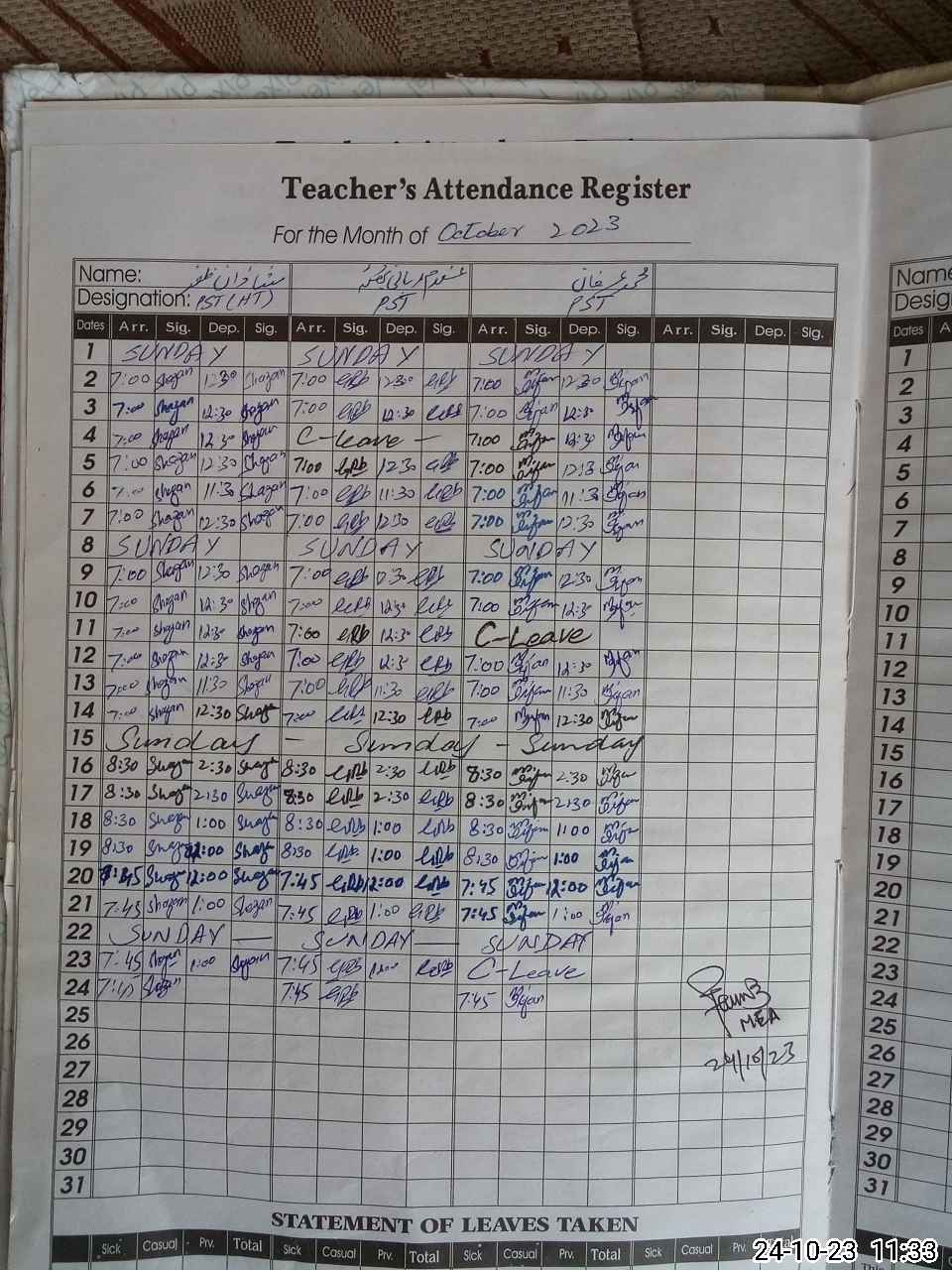 | CNIC | Full Name | Designation | R/C | Absence During Last Calender Month |