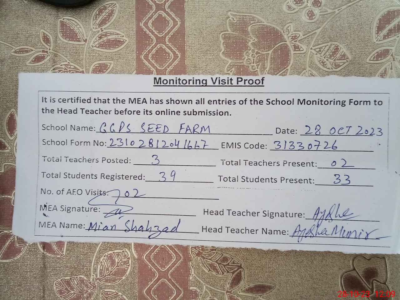 | Monitoring Date: 28-10-2023 | Start Time: 28-10-2023 11:35 AM | End Time: 28-10-2023 12:09 PM | Name of MEA: Sh**** Ah**** | |