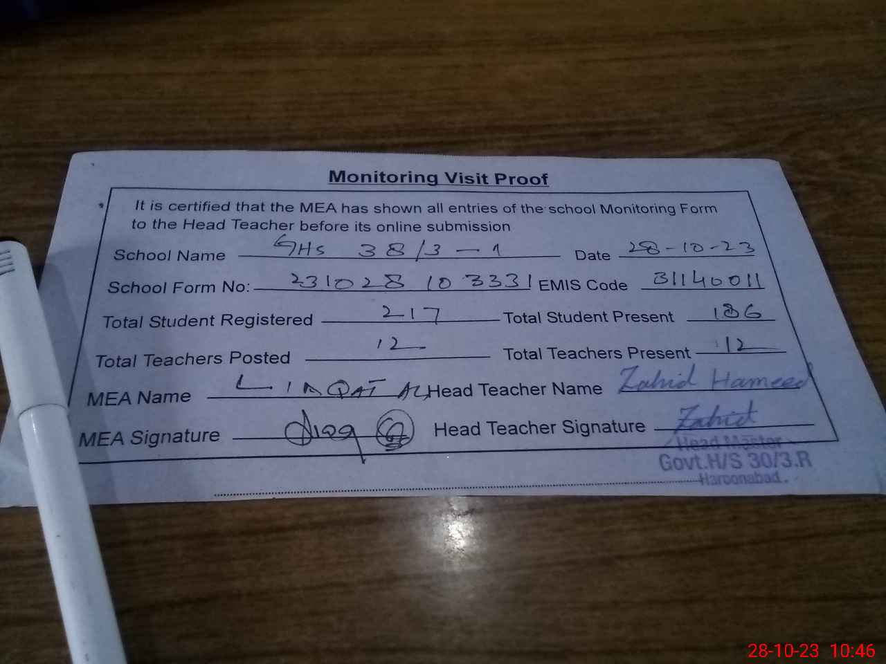 | Certified that this School was Inspected by the Undersigned MEA/DMO Today and the Information Stated Above is as Per Record. | |||||
