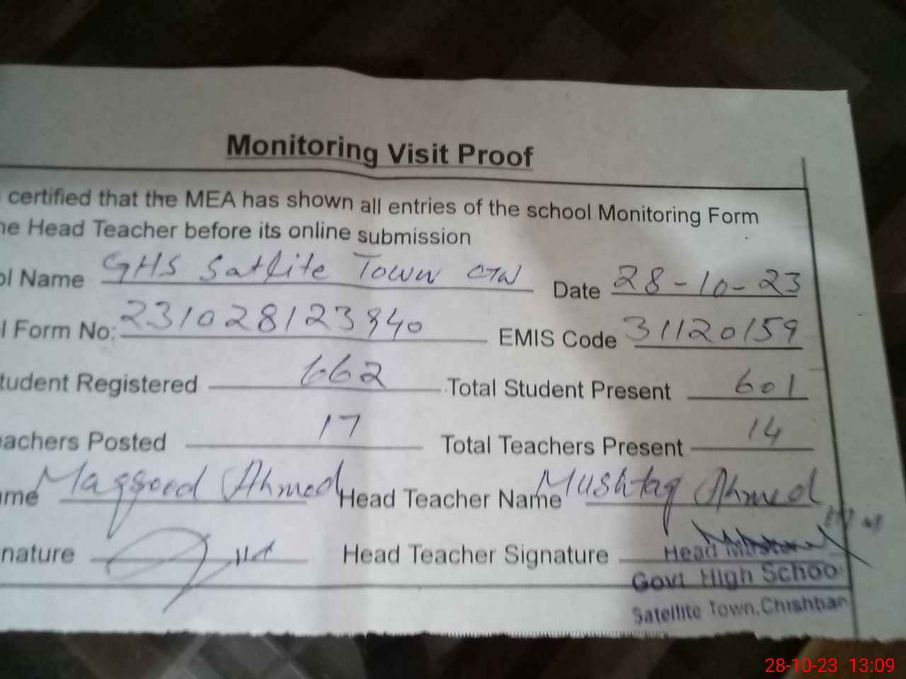 | EMIS Code: 31120159 | Name of School: GHS SATLITE TOWN CHISHTIAN | |||