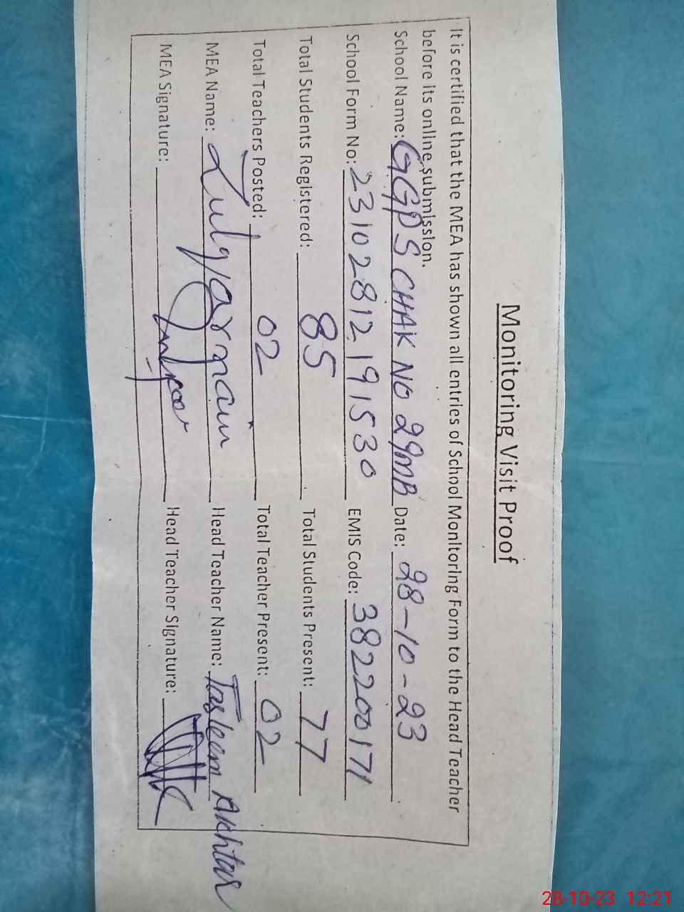 | EMIS Code: 38220171 | Name of School: GGPS CHAK NO 29 MB | |||