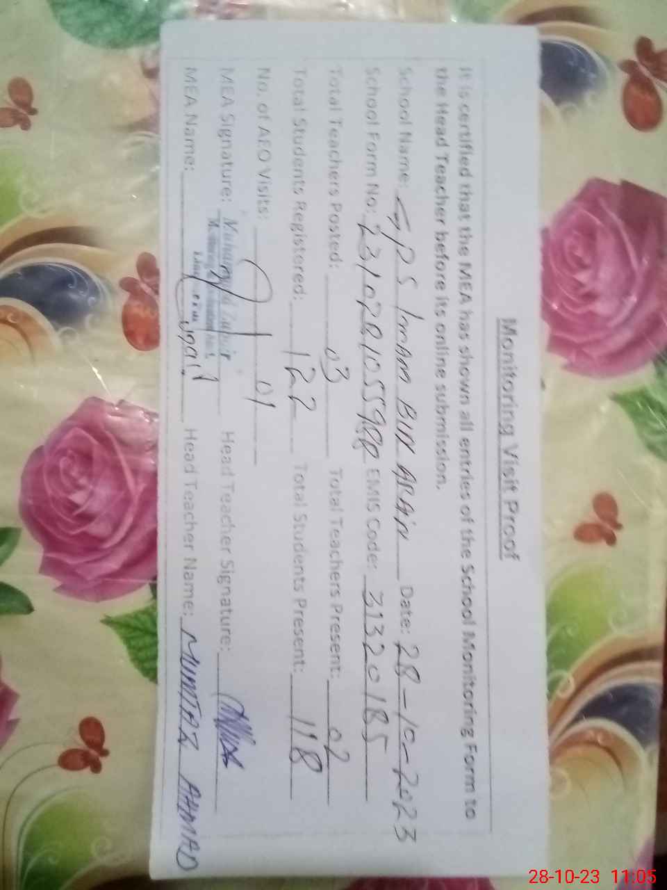 | Attendance Register | Head Teacher | MEA with School | Visit Proof |