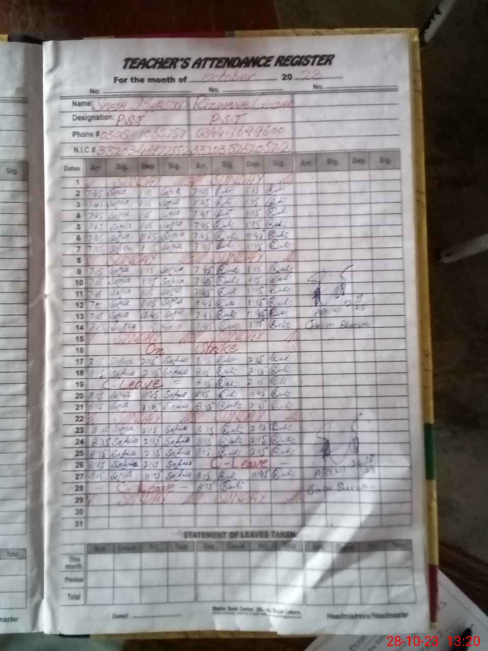 | CNIC | Full Name | Designation | R/C | Absence During Last Calender Month |