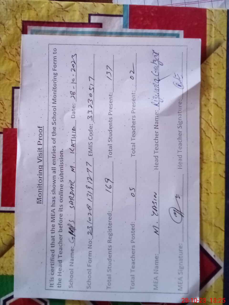 | EMIS Code: 33230517 | Name of School: GMPS SARDAR MUHAMMAD KATHIA | |||