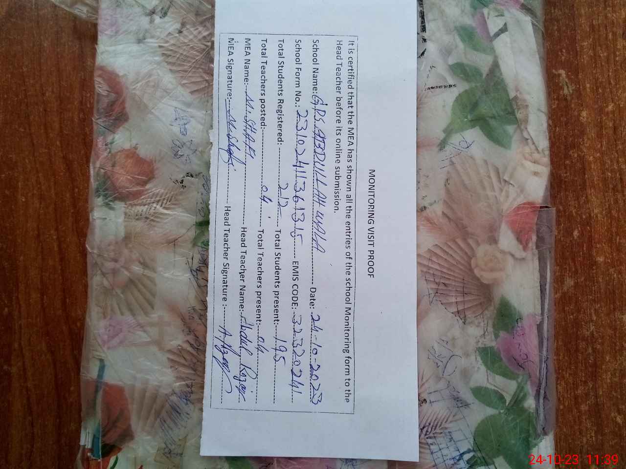 | Attendance Register | Head Teacher | MEA with School | Visit Proof |