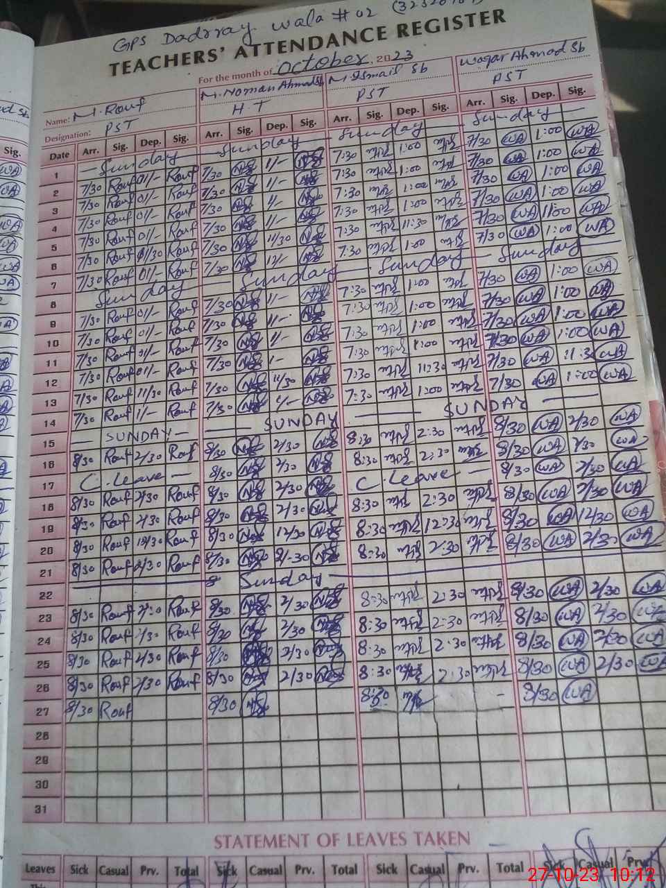 | CNIC | Full Name | Designation | R/C | Absence During Last Calender Month |