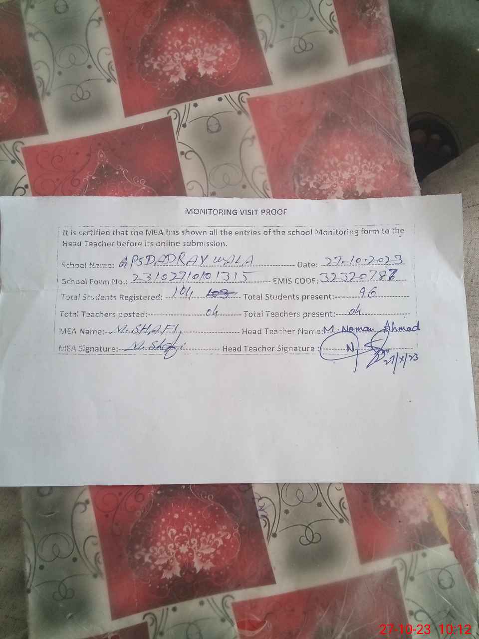 | Attendance Register | Head Teacher | MEA with School | Visit Proof |