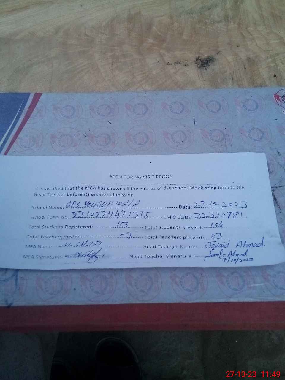| Attendance Register | Head Teacher | MEA with School | Visit Proof |