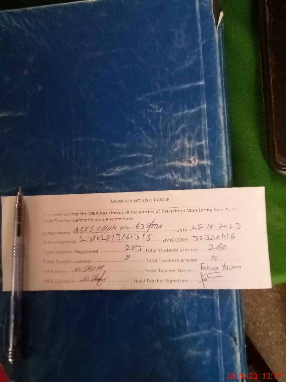 | Attendance Register | Head Teacher | MEA with School | Visit Proof |