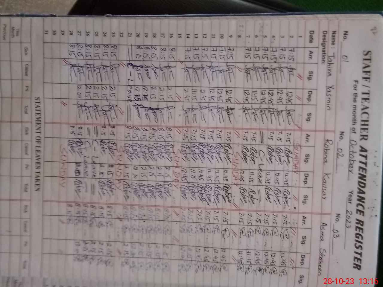 | Leave | Duty | Absent | Maternity | Medical | Ex- Pak |