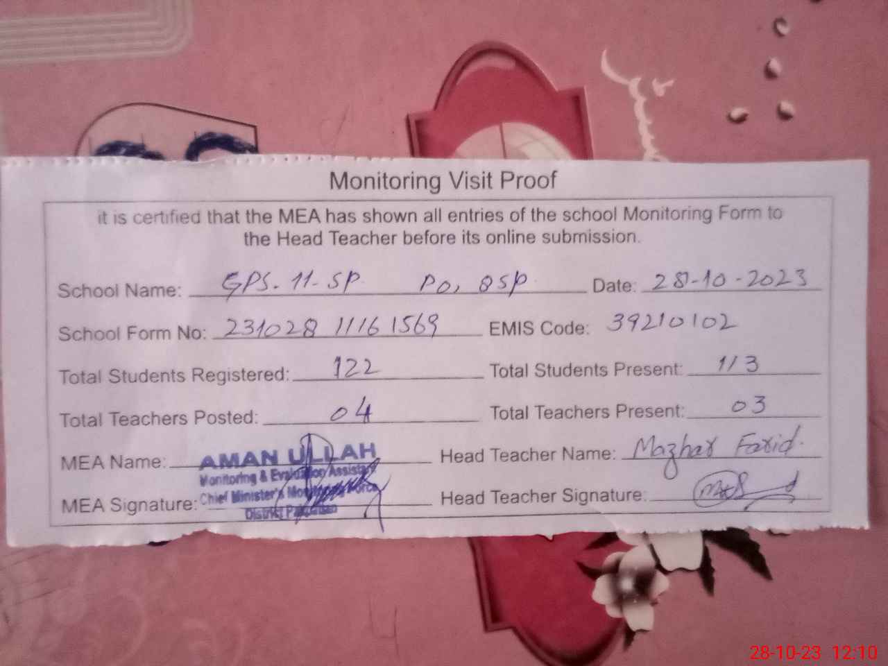 | Attendance Register | Head Teacher | MEA with School | Visit Proof |